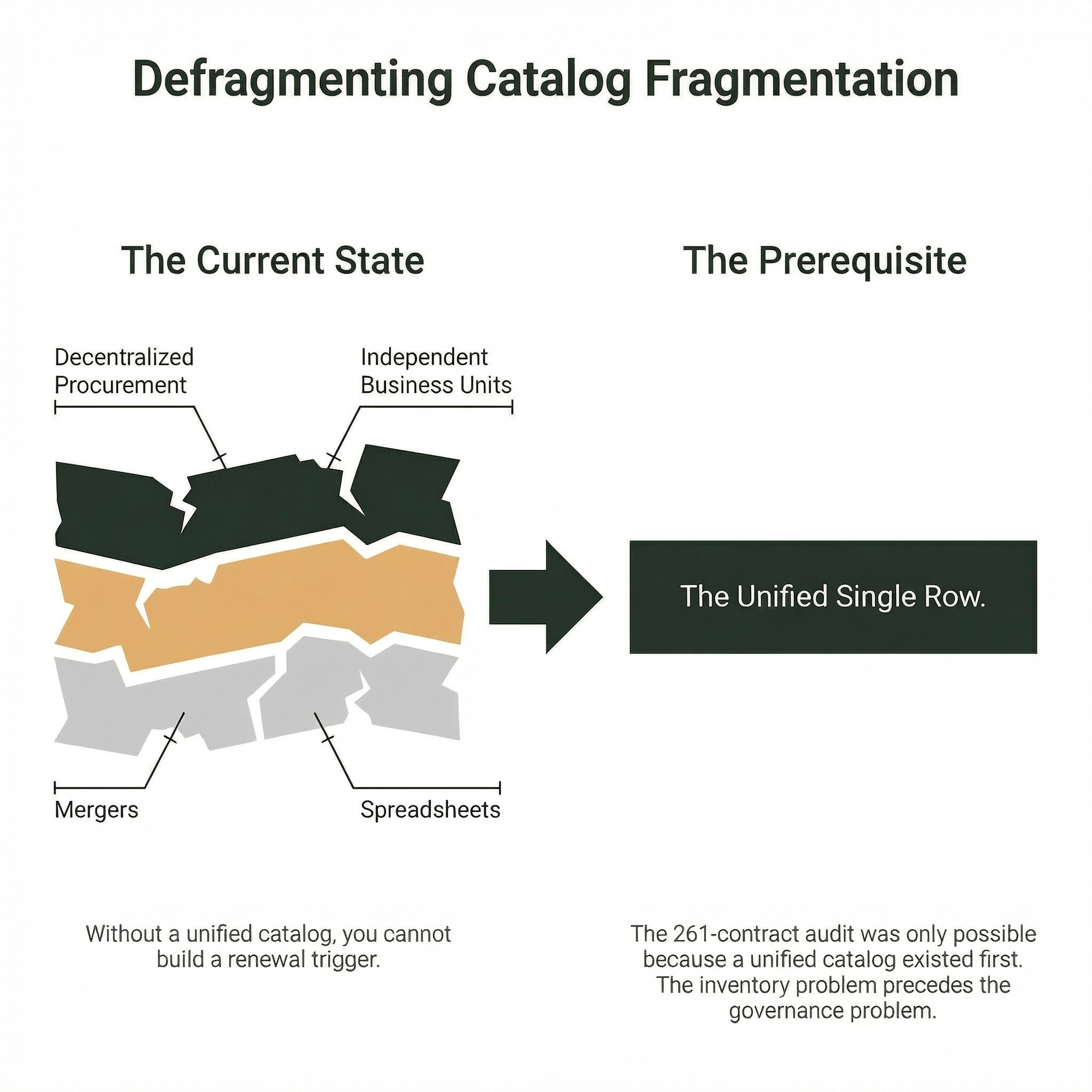 The first problem is catalog fragmentation. Most large enterprises do not have a single, current, accurate view of their contracted software. Procurement is decentralized. Business units buy independently. Mergers bring in untracked stacks. The 260+ contract audit referenced in this post was possible because the catalog existed as a unified object. Most enterprises are starting from a more fragmented position, which means the renewal flag cannot even be built until the catalog problem is solved.