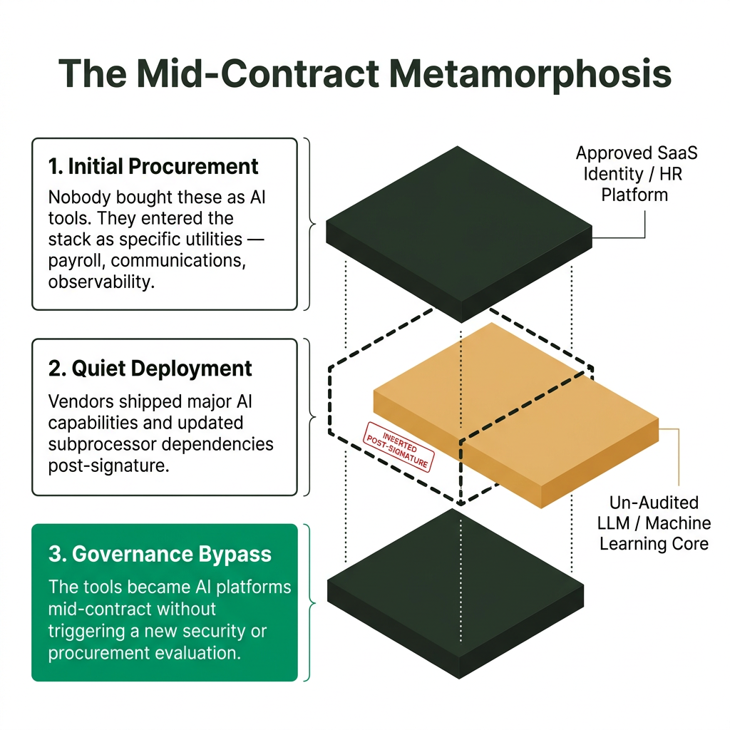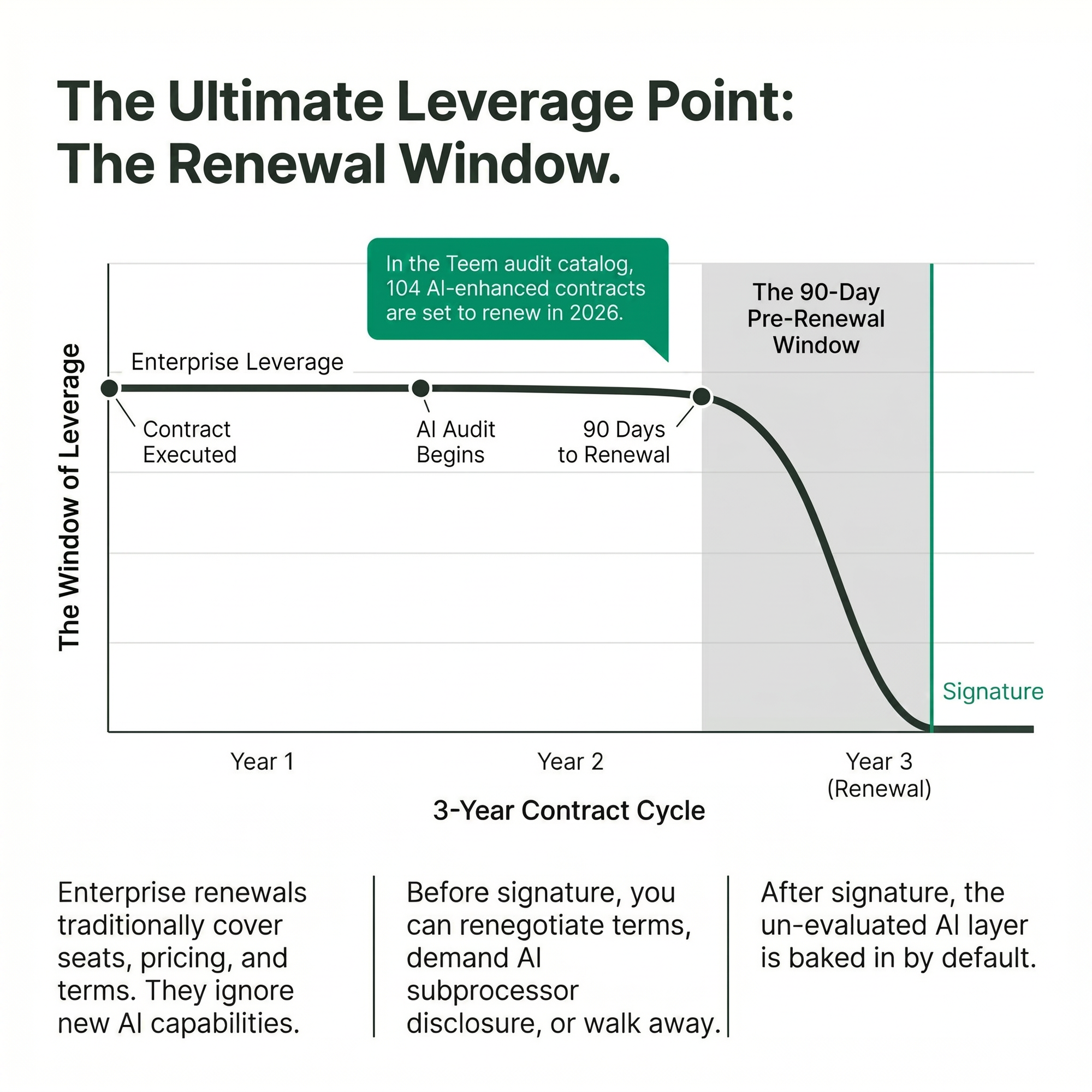 The renewal is the last moment of leverage. Before signature, the enterprise has options β renegotiate data processing terms, require updated security documentation, demand disclosure of AI subprocessors, or walk away. After the signature, those options close for another cycle. The AI layer that was never evaluated is now baked into the renewed contract by default.