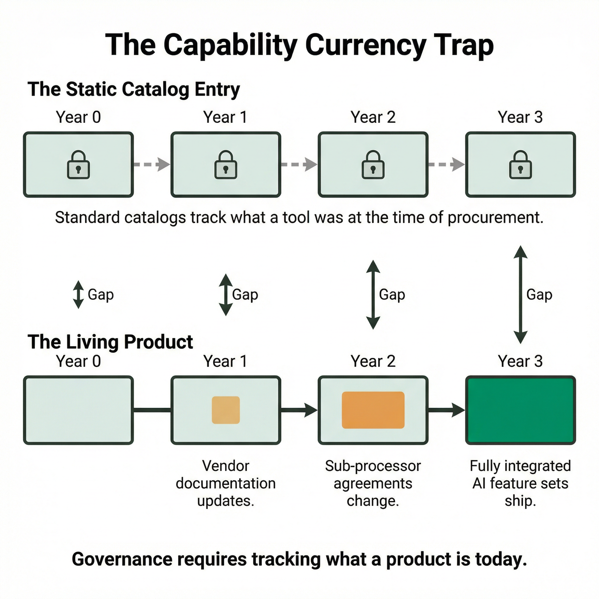 The second problem is the capability currency. Even organizations with a maintained catalog typically track what a tool was at the time of procurement, not what it is now. Vendor documentation updates. AI features ship quietly. Subprocessor agreements change without notification. The catalog entry for a tool approved three years ago reflects the product as it existed then, not as it exists at the moment of renewal.