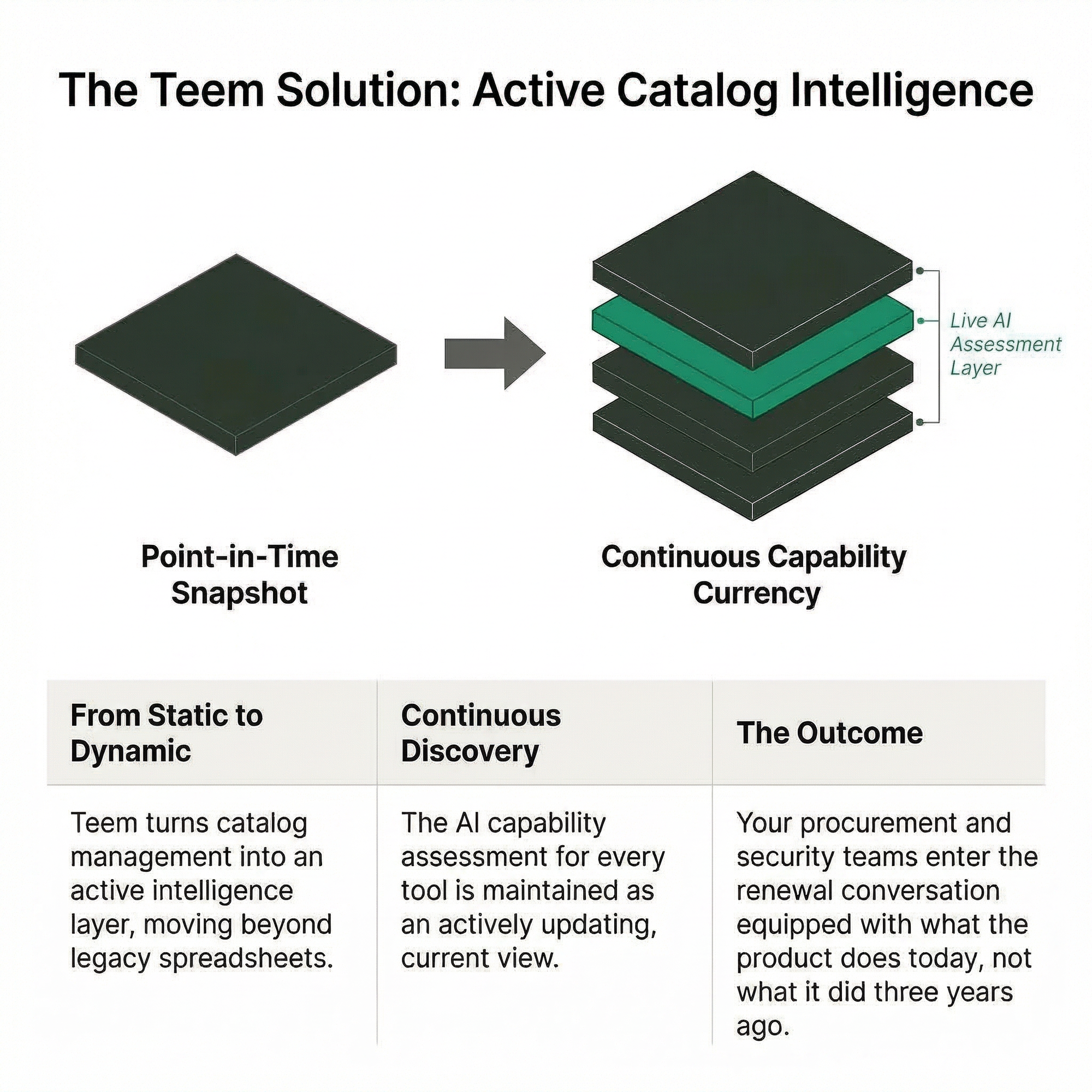Standard catalogs track what a tool was at the time of procurement, not what it is today. And without a unified catalog to begin with, the renewal trigger cannot be built. The inventory problem precedes the governance problem.
