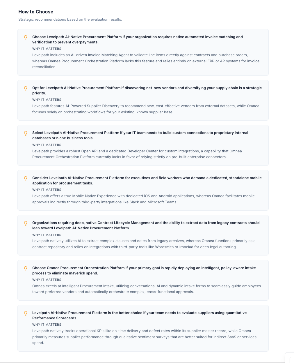Insight 1: Invoice Reconciliation Sits Outside the Platform for Omnea Users. Omnea does not natively support automated invoice matching. For organizations where preventing overpayments is a primary procurement objective, this is not a minor gap — it means a core financial control point sits entirely outside the procurement platform. Levelpath's AI-driven Invoice Matching Agent, launched in December 2025, validates line items against contracts and purchase orders in-platform, keeping that control visible to procurement rather than buried in a separate AP system.