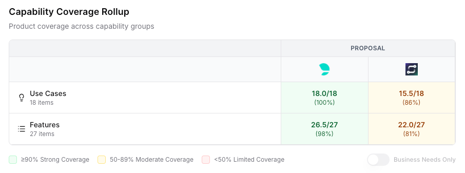 - ✅ Complete 18-point use case evaluation with individual scores per product