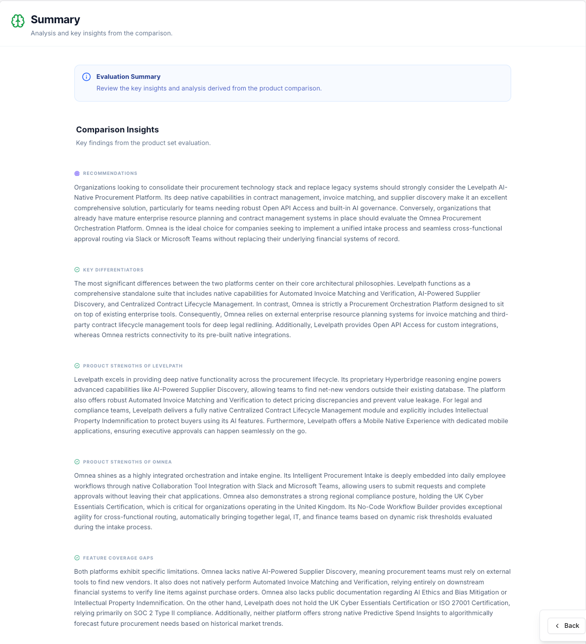 Levelpath covers all 18 evaluated use cases, including several that require deep native AI infrastructure, such as automated invoice matching, AI-powered supplier discovery, and contract data extraction from legacy documents. Invoice Automation, launched in December 2025, extends the platform's scope toward full procure-to-pay, with an AI-driven Invoice Matching Agent that validates line items against contracts and purchase orders in-platform. Organizations replacing a fragmented mix of point solutions will find that the native breadth of capabilities directly addresses the consolidation gap. The primary caveat: organizations already invested in mature ERP or CLM systems may find themselves paying for functionality they already have elsewhere.