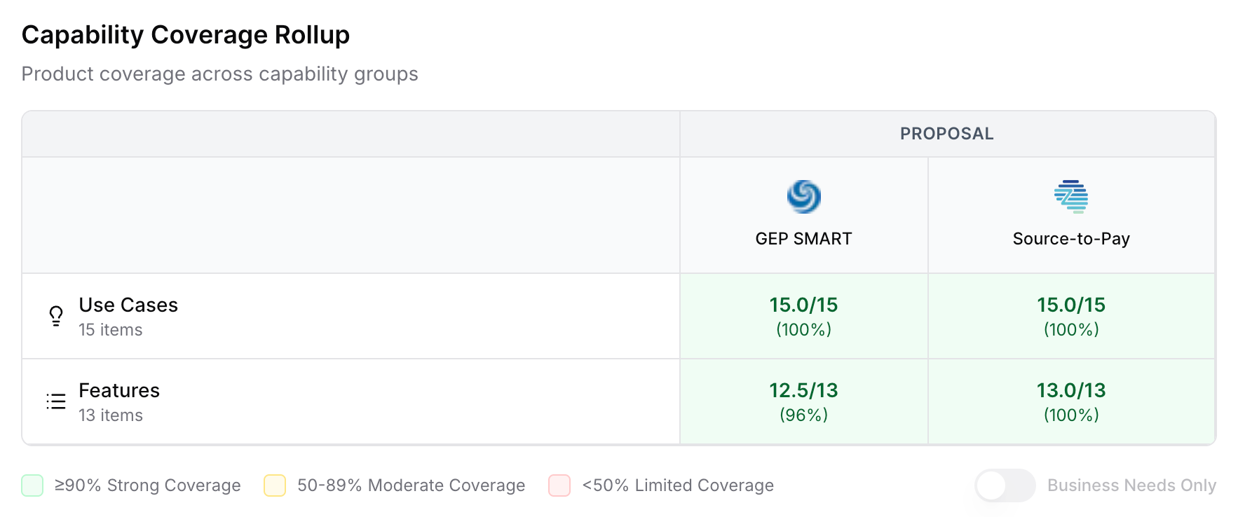 Both platforms score 100% on use-case coverage and differ on only one of 13 features. That gap — Collaboration Tool Integration — is not incidental. It reflects a deliberate product philosophy: GEP SMART has invested in a unified proprietary workspace, while Zycus has invested in meeting users where they already work. For procurement leaders, the question is whether user adoption risk lies within the procurement tool or within the organization's change management capacity.